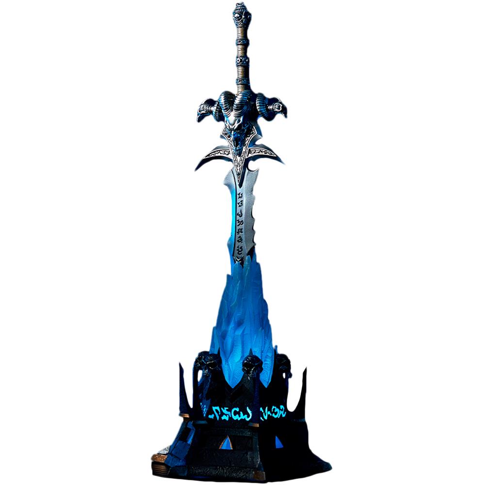 Frostmourne, la legendaria espada lúgubre famosa a lo largo de la vasta historia de Azeroth, no solo sirvió como arma de inmenso poder, sino que también marcó la trágica transformación del príncipe heredero Arthas Menethil de Lordaeron en el temido Rey Exánime. Esculpida con aleación de zinc de primera calidad, esta réplica meticulosamente detallada captura la esencia de la espada original. El acabado helado de la espada crea un brillo etéreo en toda su superficie, mientras que los filos afilados parecen irradiar el mismo poder que una vez congeló la sangre de los héroes más poderosos de Azeroth. La exclusiva base LED da vida a esta pieza con efectos rúnicos iluminados, creando una atmósfera inmersiva que tiende un puente entre Rasganorte y la realidad.