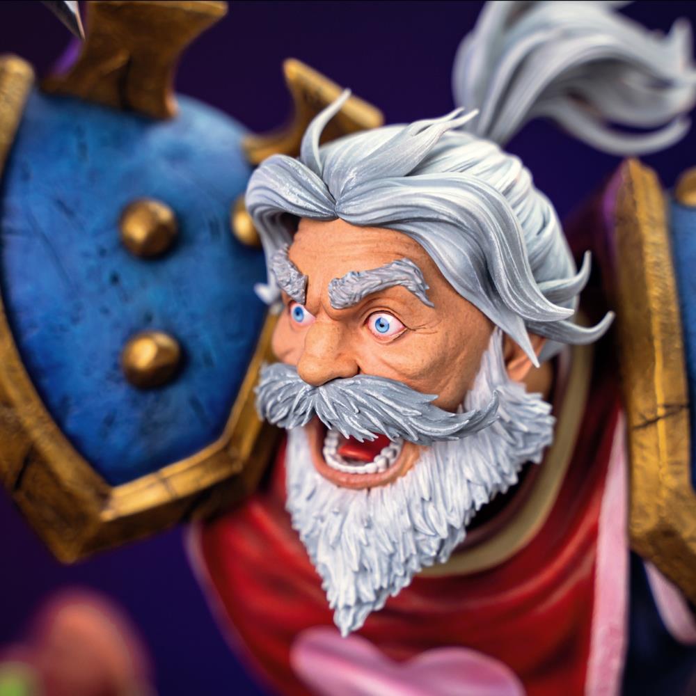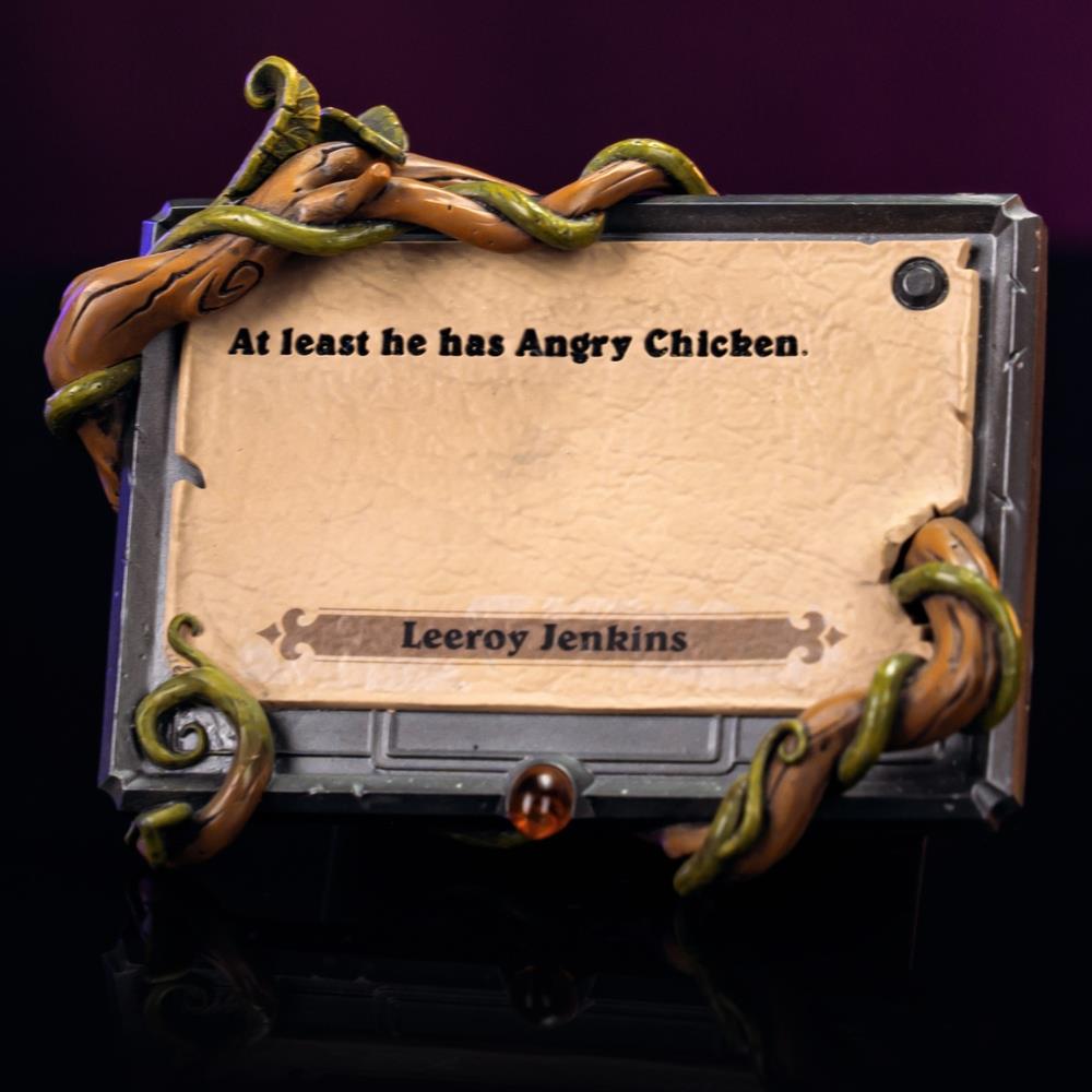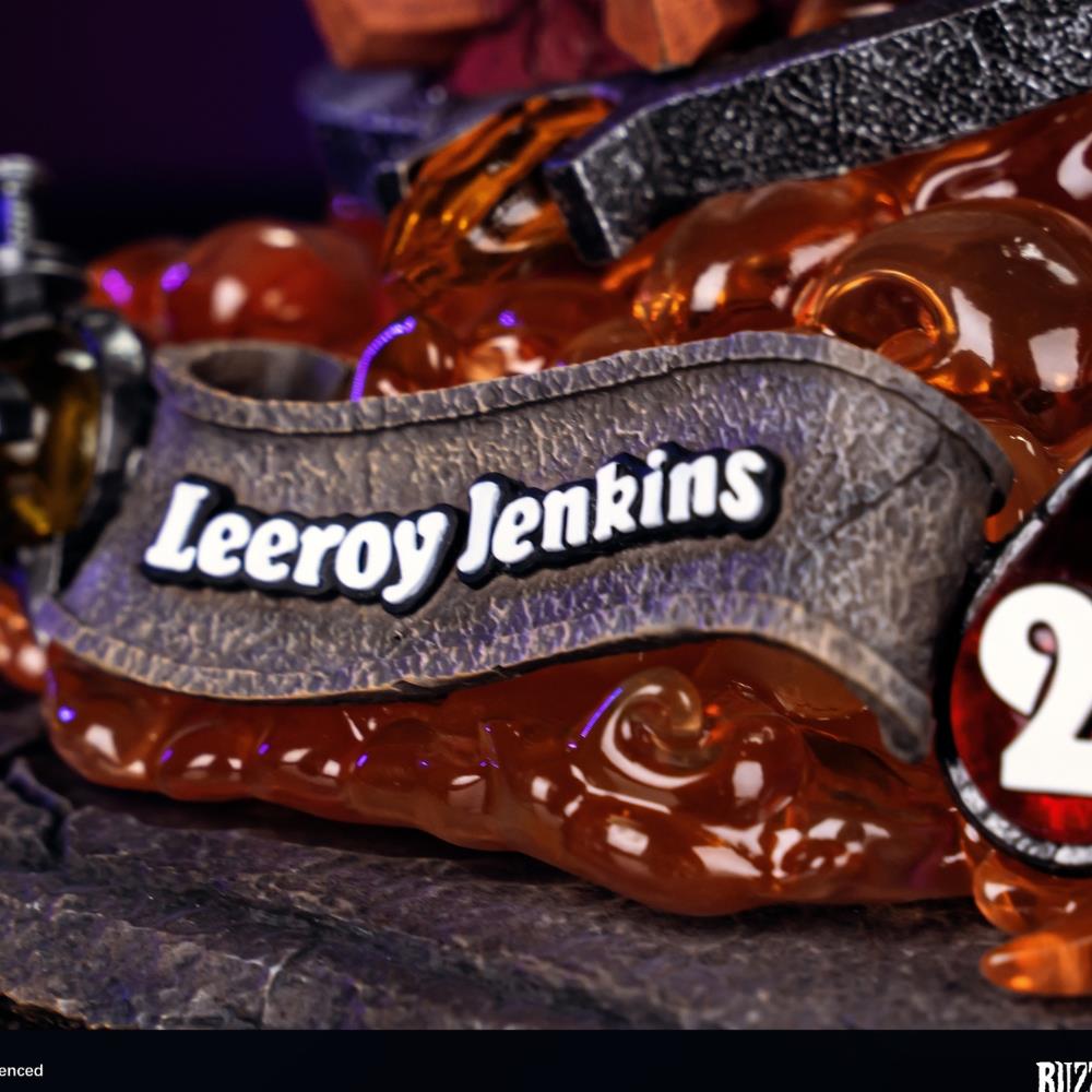 «¡Leeroooooy Jeeeenkiiiiins!» HEX Collectibles y Blizzard Entertainment se complacen en presentar la estatua de Leeroy Jenkins, inspirada en una de las famosas cartas de esbirros neutrales de Hearthstone ® . Cada línea grabada del rostro gruñón de Leeroy, cada ondulación de sus músculos abultados y cada corte de su armadura maltrecha han sido meticulosamente esculpidos para recrear el momento clásico. Su mano derecha empuña su poderosa espada, mientras que la izquierda sostiene, increíblemente, una pata de pollo a medio comer. La mirada enloquecida de sus ojos desorbitados y su boca abierta en un grito de guerra te hacen sentir que podría salir disparado de la estatua en cualquier momento.