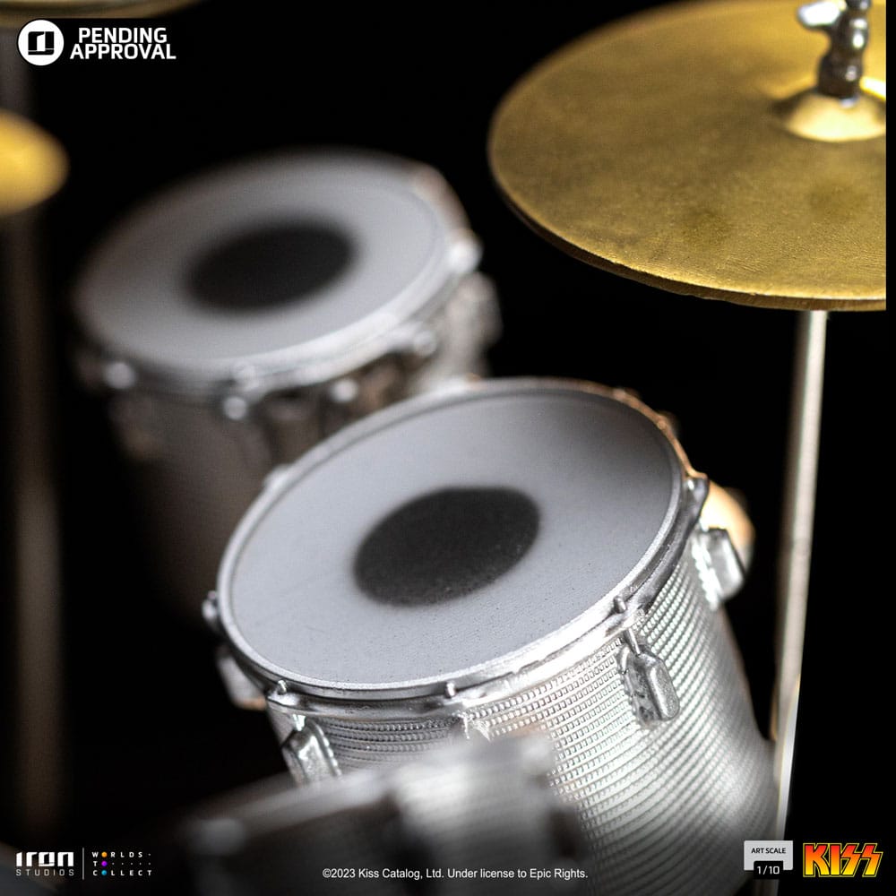 Established as the Catman character on the hard rock band KISS, Peter Criss is the original drummer of the group. Besides playing the drums, Criss also did the vocals of some of the most popular songs of the band, like Beth (co-written by him, the song got to #7 on the Billboard Hot 100), Black Diamond, Hard Luck Woman, Nothin’ to Lose among others. With raised fists while holding his drumsticks, the feline band member gets ready to make his drums reverberate like thunder in the statue «Peter Criss a.k.a. The Catman – Kiss – Art Scale 1/10» by Iron Studios, with the looks inspired by the cover of the album Alive! from 1975, considered by many as one of the best live albums of all time! Since the beginning in 1973 in the city of New York, the co-founder leaders Paul Stanley (vocals and guitar) and Gene Simmons (vocals and bass), alongside Ace Frehley (guitar and vocals) and Peter Criss (acoustic drums, percussion, and vocals) took on the personas of the characters The Demon (Simmons), Starchild (Stanley), Spaceman (Frehley) and Catman (Criss), aligning with the respective design of their looks. The musician quartet, wearing bold and black leather costumes, boots with huge platform heels, and a dramatic makeup inspired by the Kabuki Japanese theater, as night creatures dressed to kill, changed the concept of musical entertainment with their elaborate theatrical shows, including flaming guitars, spitting fire and blood, pyrotechnics, and other effects, the band KISS constitute one of the biggest cultural impacts of the decade of 1970, changing the concepts of music and entertainment, becoming historically significant not only in the context and world of Rock’n’roll, but also by influencing new artists and bands of other musical styles in many segments. KISS was introduced to the Rock and Roll Hall of Fame and Museum in 2014, joining the most known and influential artists that had a great impact in the pop and rock industry. With 30 Gold Records, more than 103 million albums sold worldwide, the band continues to perform in makeup, with the presence of Stanley and Simmons from the original formation. No other band used its image or marketing better, being adapted to the Marvel comics, where Criss’ character, alongside the other band members of KISS, received superpowers from a wizard. The Catman in the comic books has great superhuman strength and agility and good fighting skills, which became even better with experience.